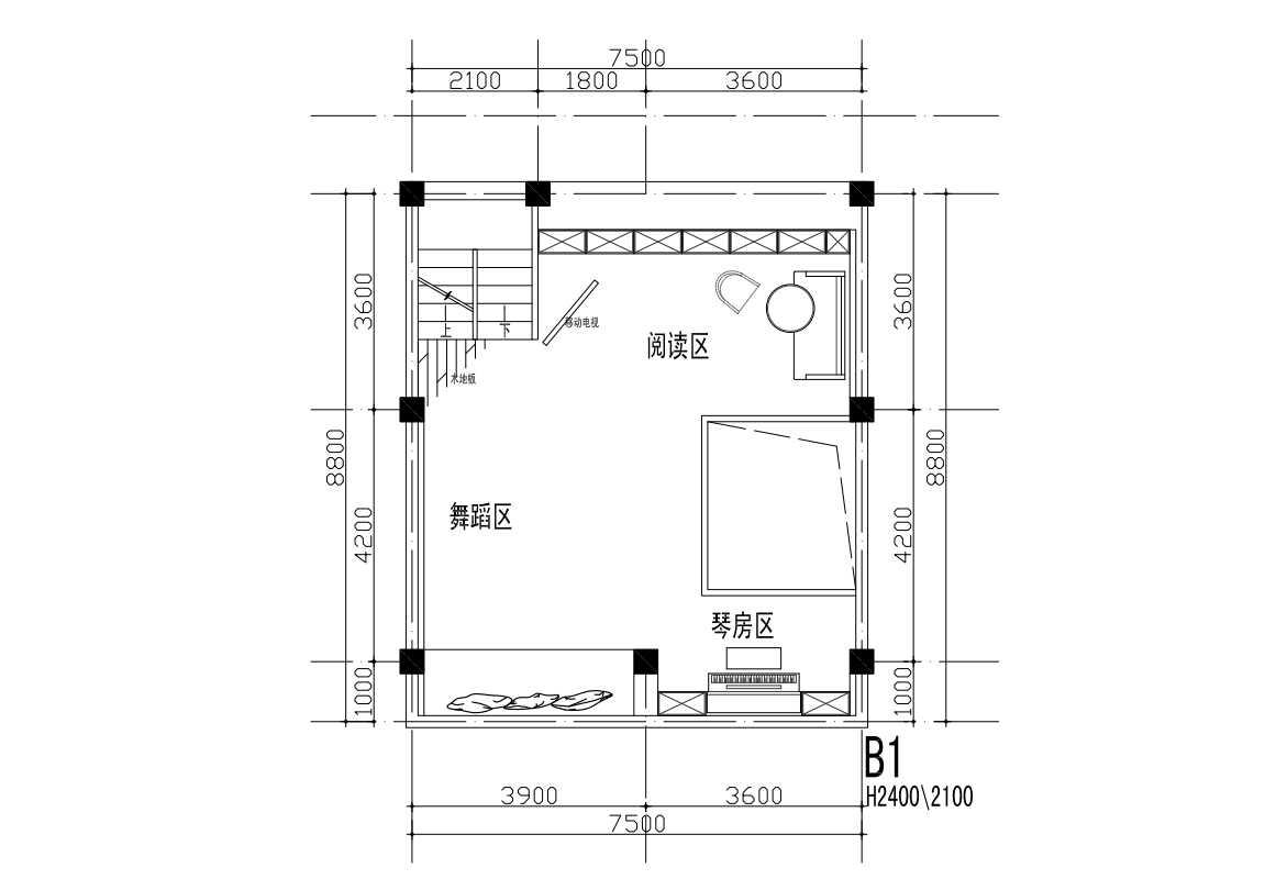 练琴区,搭配全身镜设计,同时作为练舞区。集音乐与舞蹈于一体,是艺术交流的绝佳空间。